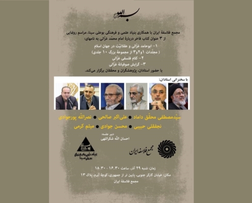 مراسم رونمایی از ۳ کتاب درباره امام محمد غزالی با حضور استادان و پژوهشگران مطرح کشوری در مجمع فلاسفه ایران برگزار می شود.